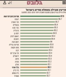Согласно докладу Центрального бюро статистики за 2023 год, лидируют в стране Модиин — 87,5 года, а также Раанана, Ход а-Шарон, Гиватаим и Кфар-Саба — все города с сильным социально-экономическим статусом. В таких муниципалитетах фиксируются самые высокие показатели продолжительности жизни.